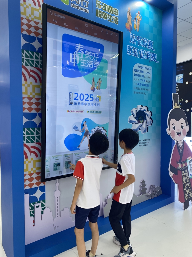 为推动“体育+文旅”深度融合,闵行区联动区内众多优质资源,推出惠民活动,汇聚景区门票、酒店住宿、文创消费等多重折扣权益,让网球的激情延伸至食、住、游、购、娱的多元消费体验,实现文旅引流促消费。展厅为观众准备了春申美好生活季手册、闵行文旅体验指南、景区宣传手册及便捷二维码,方便观众一键获取更多文旅资讯与服务。观众只需扫码,即可了解丰富多元的文旅优惠活动,领取专属福利券,凭ATP1000网球大师赛、LPGA锦标赛门票可在17家商业体的200余家品牌门店享受专属优惠。